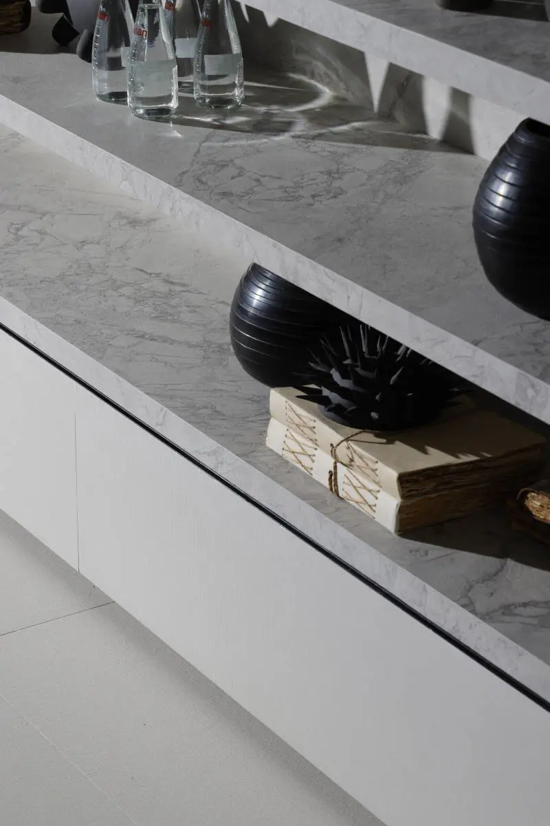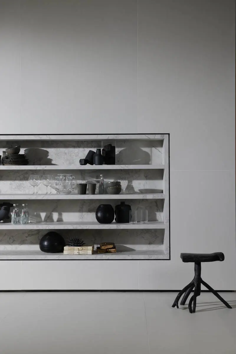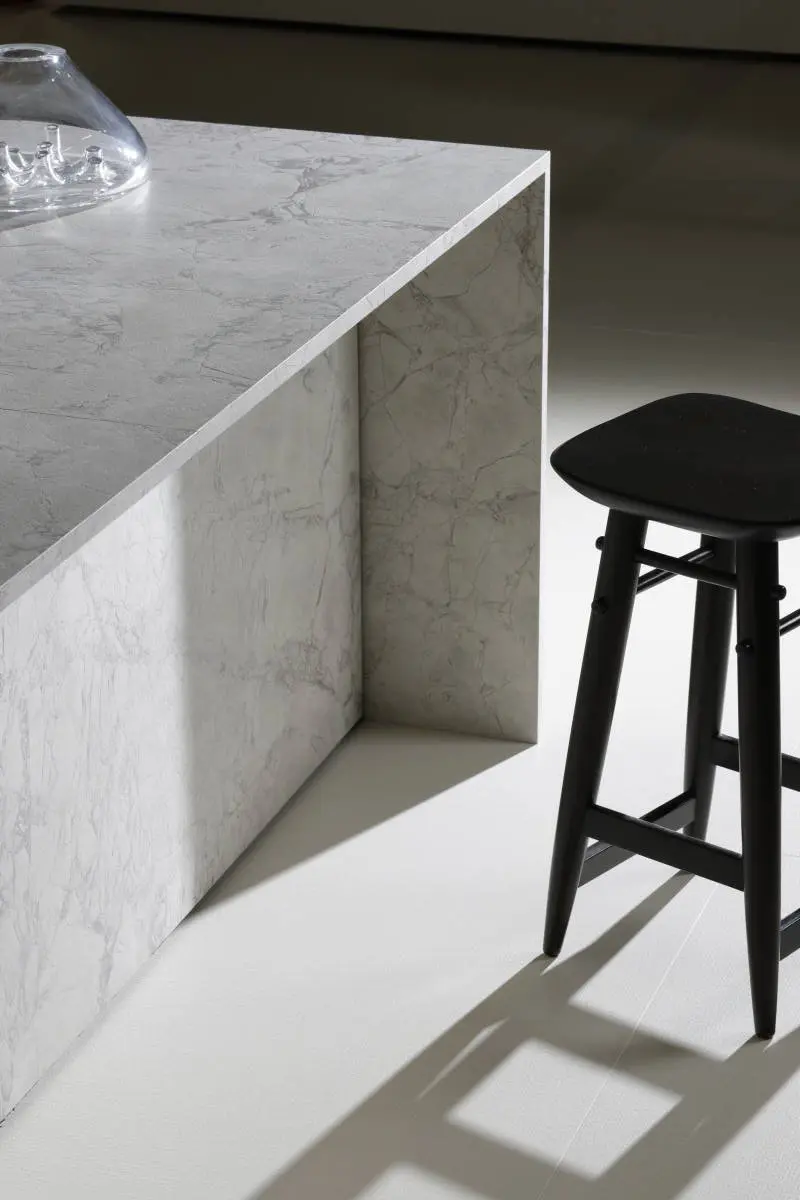 A escolha foi por uma produção minimalista, onde as peças de design assinado atuam como pontos de apoio silenciosos para que a arquitetura e os revestimentos assumissem o protagonismo.